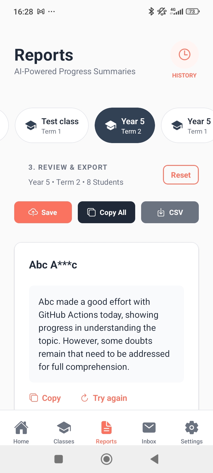 Your observations are transformed into clear, structured summaries in seconds. No late nights rewriting comments — just tap and download ready-to-use reports.